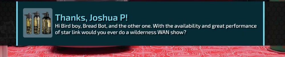 Hi Bird boy, Bread Bot, and the other one. With the availability and great performance of star link would you ever do a wilderness WAN show?