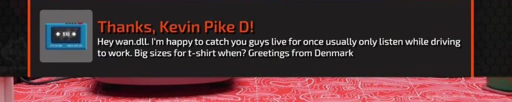 Hey wan.dll. I'm happy to catch you guys live for once usually only listen while driving to work. Big sizes for t-shirt when? Greetings from Denmark