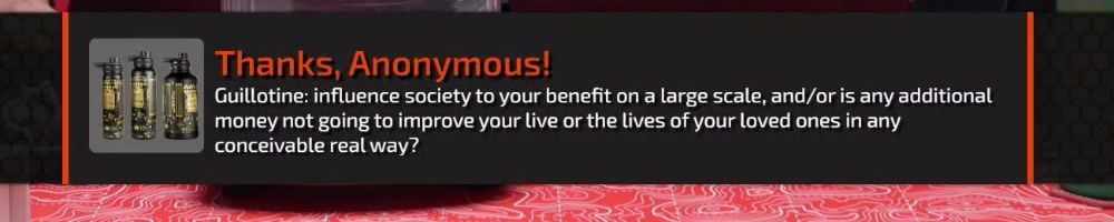 Guillotine: influence society to your benefit on a large scale, and/or is any additional money not going to improve your live or the lives of your loved ones in any conceivable real way?