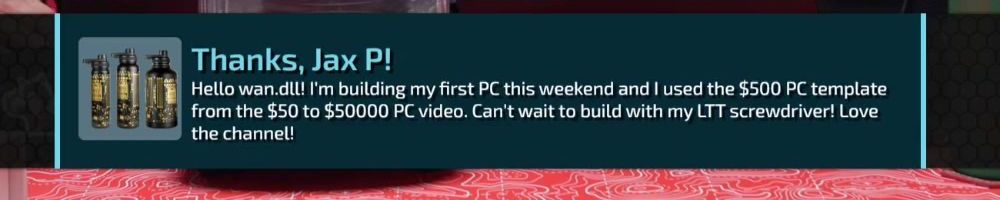Hello wan.dll! I'm building my first PC this weekend and I used the $500 PC template from the $50 to $50000 PC video. Can't wait to build with my LTT screwdriver! Love the channel!