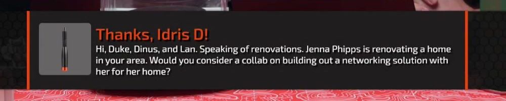 Hi, Duke, Dinus, and Lan. Speaking of renovations. Jenna Phipps is renovating a home in your area. Would you consider a collab on building out a networking solution with her for her home?