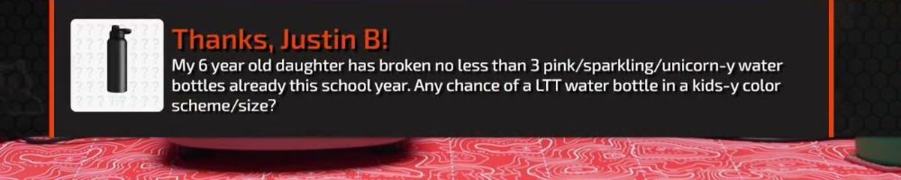 My 6 year old daughter has broken no less than 3 pink/sparkling/unicorn-y water bottles already this school year. Any chance of a LTT water bottle in a kids-y color scheme/size?