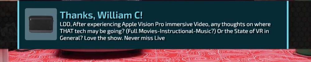 LDD, After experiencing Apple Vision Pro immersive Video, any thoughts on where THAT tech may be going? (Full Movies-Instructional-Music?) Or the State of VR in General? Love the show. Never miss Live