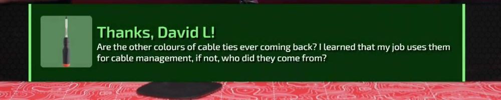 Thanks, David L! Are the other colours of cable ties ever coming back? I learned that my job uses them for cable management, if not, who did they come from?