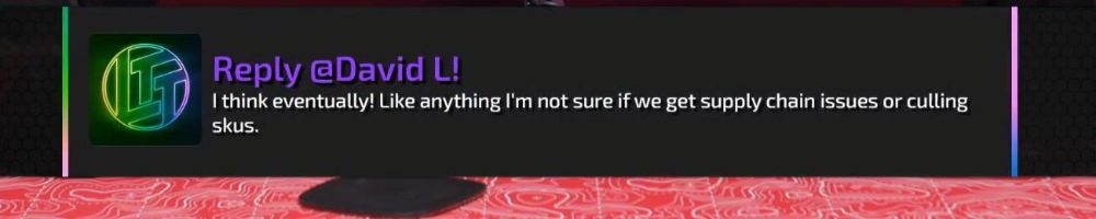 Reply @David L! I think eventually! Like anything I'm not sure if we get supply chain issues or culling skus.
