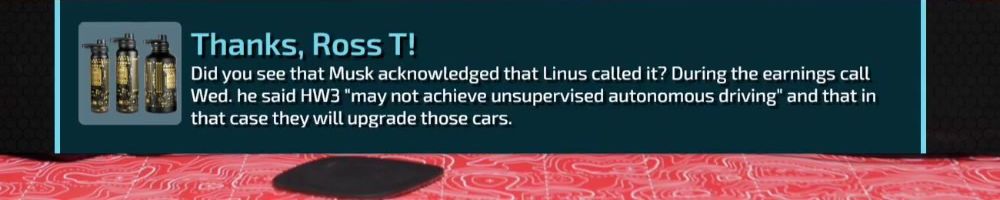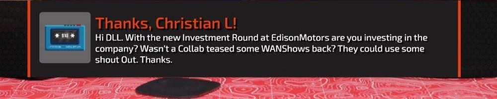 Thanks, Christian L! Hi DLL. With the new Investment Round at EdisonMotors are you investing in the company? Wasn't a Collab teased some WANShows back? They could use some shout Out. Thanks.