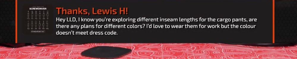 Thanks, Lewis H! Hey LLD, I know you're exploring different inseam lengths for the cargo pants, are there any plans for different colors? I'd love to wear them for work but the colour doesn't meet dress code.