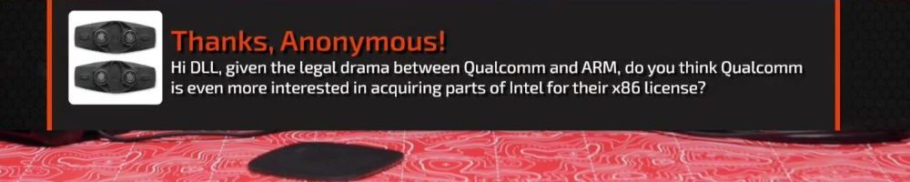 Thanks, Anonymous! Hi DLL, given the legal drama between Qualcomm and ARM, do you think Qualcomm is even more interested in acquiring parts of Intel for their x86 license?