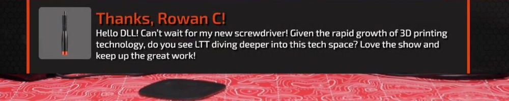 Thanks, Rowan C! Hello DLL! Can't wait for my new screwdriver! Given the rapid growth of 3D printing technology, do you see LTT diving deeper into this tech space? Love the show and keep up the great work!