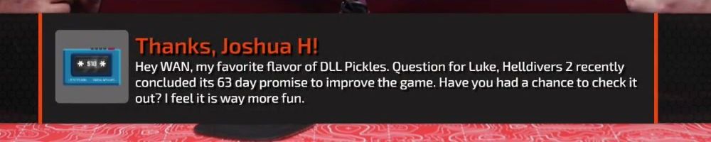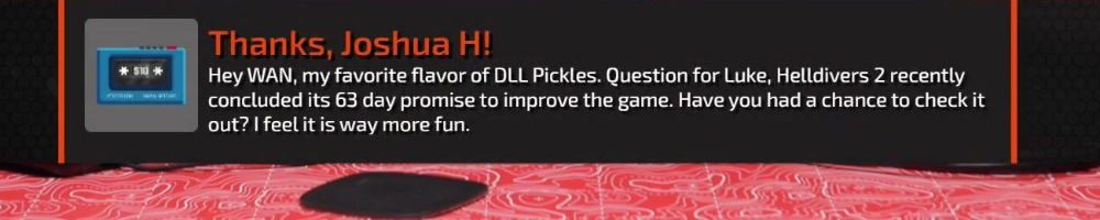 Thanks, Joshua H! Hey WAN, my favorite flavor of DLL Pickles. Question for Luke, Helldivers 2 recently concluded its 63 day promise to improve the game. Have you had a chance to check it out? I feel it is way more fun.