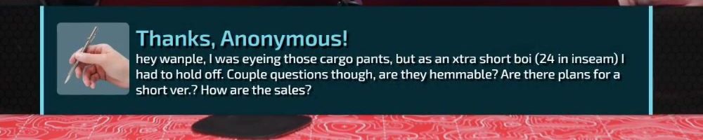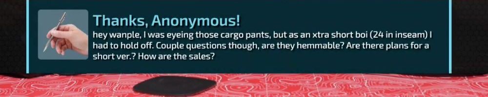 Thanks, Anonymous! hey wanple, I was eyeing those cargo pants, but as an xtra short boi (24 in inseam) I had to hold off. Couple questions though, are they hemmable? Are there plans for a short ver.? How are the sales?