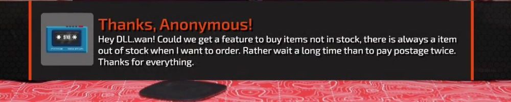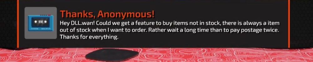 Thanks, Anonymous! Hey DLL.wan! Could we get a feature to buy items not in stock, there is always a item out of stock when I want to order. Rather wait a long time than to pay postage twice. Thanks for everything.