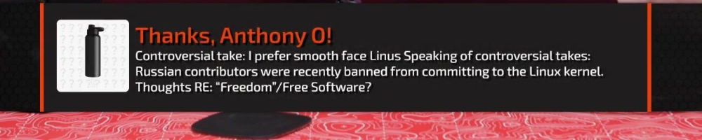 Thanks, Anthony O! Controversial take: I prefer smooth face Linus Speaking of controversial takes: Russian contributors were recently banned from committing to the Linux kernel. Thoughts RE: "Freedom"/Free Software?