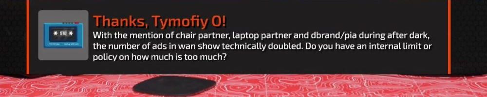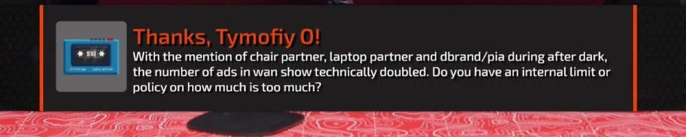 Thanks, Tymofiy O! With the mention of chair partner, laptop partner and dbrand/pia during after dark, the number of ads in wan show technically doubled. Do you have an internal limit or policy on how much is too much?