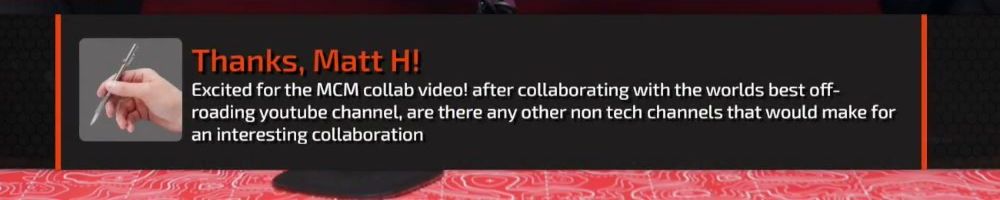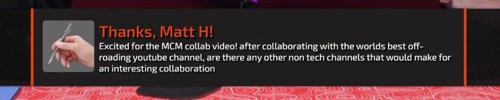 Thanks, Matt H! Excited for the MCM collab video! after collaborating with the worlds best off-roading youtube channel, are there any other non tech channels that would make for an interesting collaboration