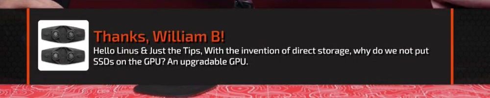 Thanks, William B! Hello Linus & Just the Tips, With the invention of direct storage, why do we not put SSDs on the GPU? An upgradable GPU.