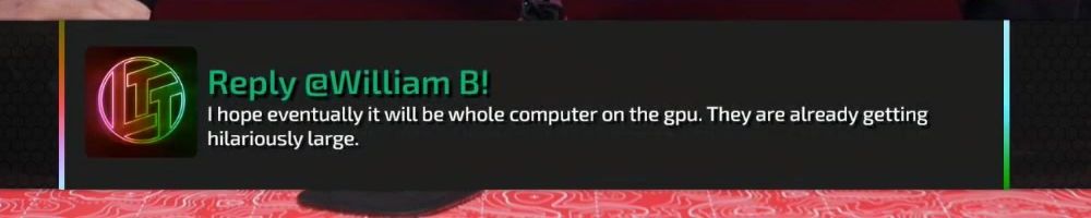 Reply @William B! I hope eventually it will be whole computer on the gpu. They are already getting hilariously large.