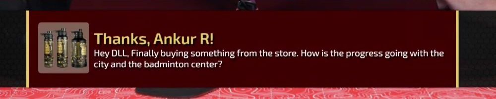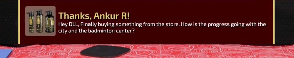 Thanks, Ankur R! Hey DLL, Finally buying something from the store. How is the progress going with the city and the badminton center?