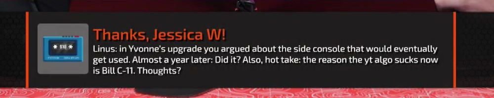 Thanks, Jessica W! Linus: in Yvonne's upgrade you argued about the side console that would eventually get used. Almost a year later: Did it? Also, hot take: the reason the yt algo sucks now © is Bill C-11. Thoughts?