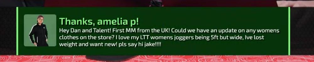 Thanks, amelia p! Hey Dan and Talent! First MM from the UK! Could we have an update on any womens clothes on the store? I love my LTT womens joggers being 5ft but wide, Ive lost weight and want new! pls say hi jake!!!