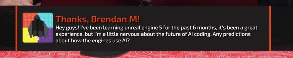 Thanks, Brendan M! Hey guys! I've been learning unreal engine 5 for the past 6 months, it's been a great experience, but I'm a little nervous about the future of Al coding. Any predictions about how the engines use Al?