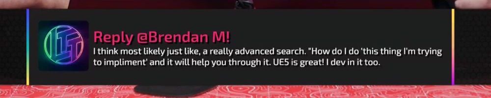 Reply @Brendan M! I think most likely just like, a really advanced search. "How do I do 'this thing I'm trying to implment' and it will help you through it. UE5 is great! I dev in it too.