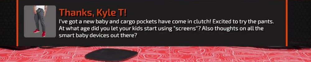 Thanks, Kyle T! I've got a new baby and cargo pockets have come in clutch! Excited to try the pants. At what age did you let your kids start using "screens"? Also thoughts on all the smart baby devices out there?