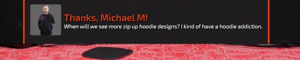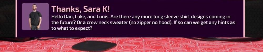 Thanks, Sara K! Hello Dan, Luke, and Lunis. Are there any more long sleeve shirt designs coming in the future? Or a crew neck sweater (no zipper no hood). If so can we get any hints as to what to expect?