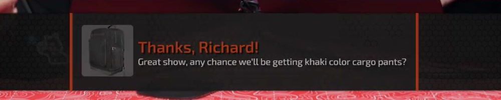Thanks, Richard! Great show, any chance we'll be getting khaki color cargo pants?