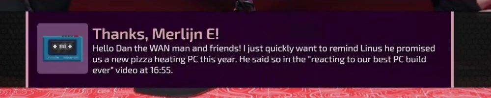 Thanks, Merlijn E! Hello Dan the WAN man and friends! | just quickly want to remind Linus he promised us a new pizza heating PC this year. He said so in the "reacting to our best PC build ever” video at 16:55.
