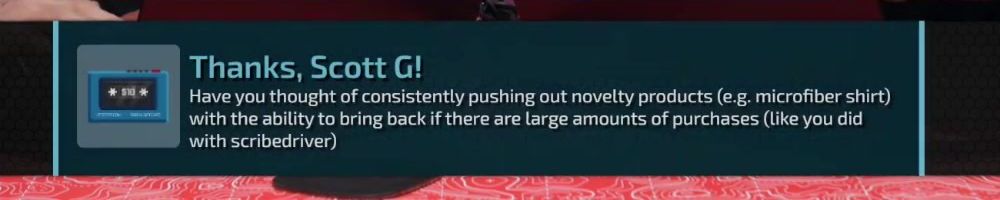 Thanks, Scott G! Have you thought of consistently pushing out novelty products (e.g. microfiber shirt) with the ability to bring back if there are large amounts of purchases (like you did with scribedriver)