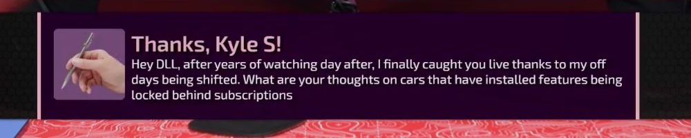 Thanks, Kyle S! Hey DLL, after years of watching day after, I finally caught you live thanks to my off days being shifted. What are your thoughts on cars that have installed features being locked behind subscriptions
