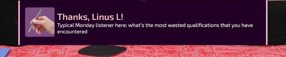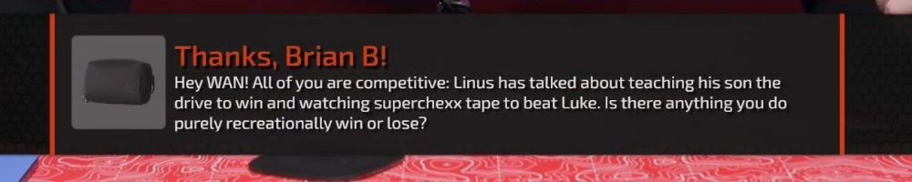 Thanks, Brian B! Hey WAN! All of you are competitive: Linus has talked about teaching his son the drive to win and watching superchexx tape to beat Luke. Is there anything you do purely recreationally win or lose?