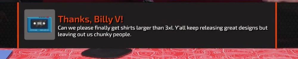 Thanks, Billy V! Can we please finally get shirts larger than 3xl. Y'all keep releasing great designs but leaving out us chunky people.