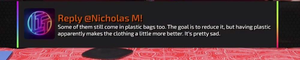 Reply @Nicholas M! Some of them still come in plastic bags too. The goal is to reduce it, but having plastic apparently makes the clothing a little more better. It's pretty sad.