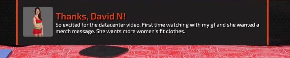 Thanks, David N! So excited for the datacenter video. First time watching with my gf and she wanted a merch message. She wants more women's fit clothes.