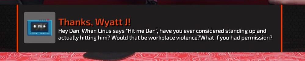 Thanks, Wyatt J! Hey Dan. When Linus says "Hit me Dan", have you ever considered standing up and actually hitting him? Would that be workplace violence? What if you had permission?
