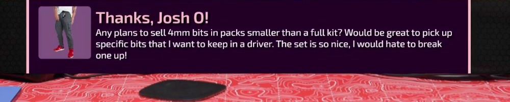 Thanks, Josh O! Any plans to sell 4mm bits in packs smaller than a full kit? Would be great to pick up specific bits that I want to keep in a driver. The set is so nice, I would hate to break one up!