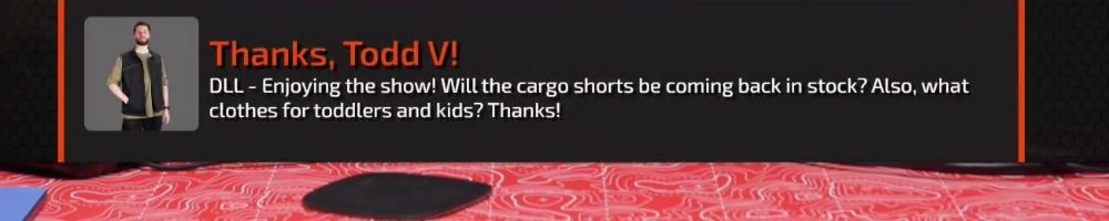 Thanks, Todd V! DLL - Enjoying the show! Will the cargo shorts be coming back in stock? Also, what clothes for toddlers and kids? Thanks!