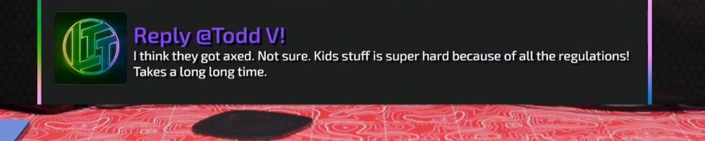 Reply @Todd V! I think they got axed. Not sure. Kids stuff is super hard because of all the regulations! Takes a long long time.