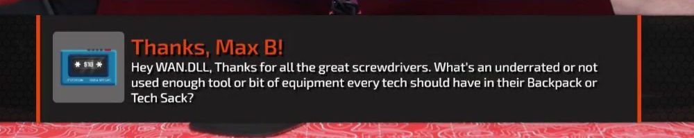Thanks, Max B! Hey WAN.DLL, Thanks for all the great screwdrivers. What's an underrated or not used enough tool or bit of equipment every tech should have in their Backpack or Tech Sack?