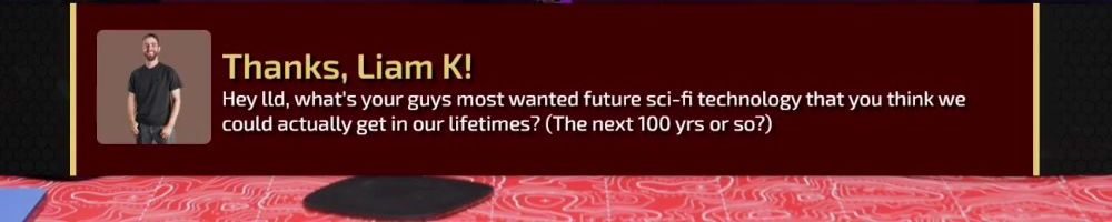 Thanks, Liam K! Hey ld, what's your guys most wanted future sci-fi technology that you think we could actually get in our lifetimes? (The next 100 yrs or so?)
