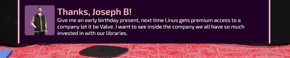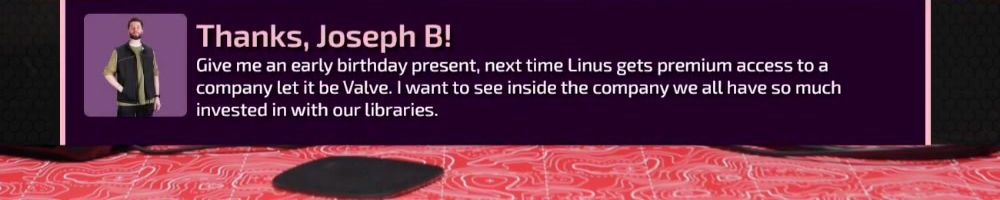 Thanks, Joseph B! Give me an early birthday present, next time Linus gets premium access to a company let it be Valve. I want to see inside the company we all have so much invested in with our libraries.