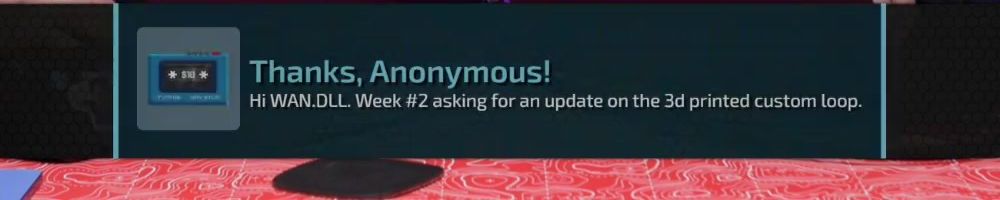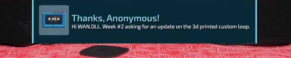 Thanks, Anonymous! Hi WAN.DLL. Week #2 asking for an update on the 3d printed custom loop.