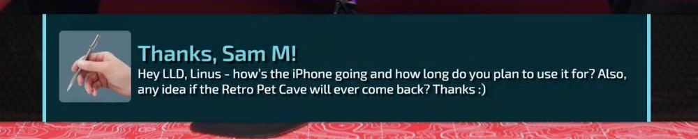Thanks, Sam M! Hey LLD, Linus - how's the iPhone going and how long do you plan to use it for? Also, any idea if the Retro Pet Cave will ever come back? Thanks :)