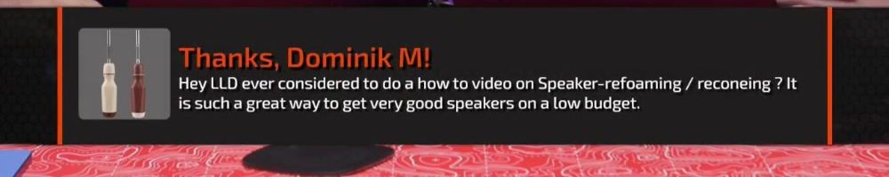 Thanks, Dominik M! Hey LLD ever considered to do a how to video on Speaker-refoaming / reconeing ? It is such a great way to get very good speakers on a low budget.