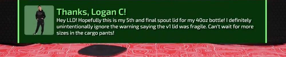 Thanks, Logan C! Hey LLD! Hopefully this is my 5th and final spout lid for my 400z bottle! | definitely unintentionally ignore the warning saying the v1 lid was fragile. Can't wait for more sizes in the cargo pants!