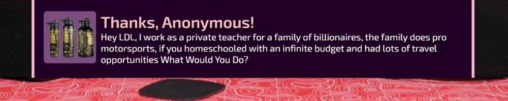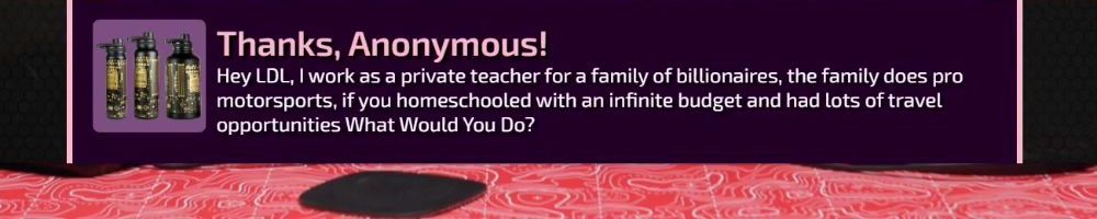 Thanks, Anonymous! Hey LDL, I work as a private teacher for a family of billionaires, the family does pro motorsports, if you homeschooled with an infinite budget and had lots of travel opportunities What Would You Do?