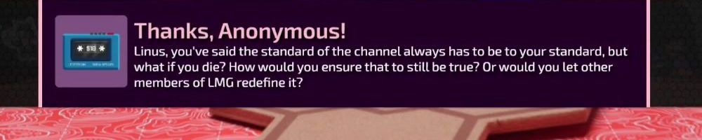 Thanks, Anonymous! Linus, you've said the standard of the channel always has to be to your standard, but what if you die? How would you ensure that to still be true? Or would you let other members of LMG redefine it?