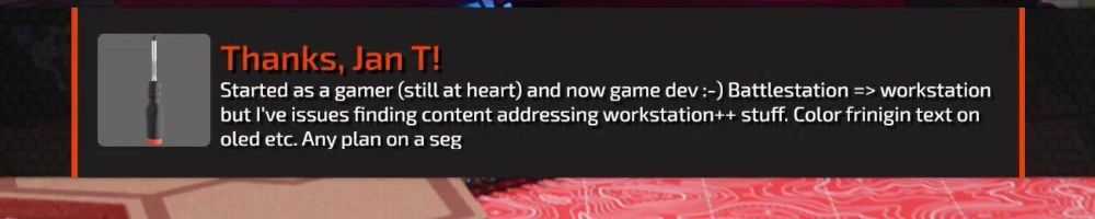 Thanks, Jan T! Started as a gamer (still at heart) and now game dev :-) Battlestation => workstation but I've issues finding content addressing workstation++ stuff. Color frinigin text on oled etc. Any plan on a seg